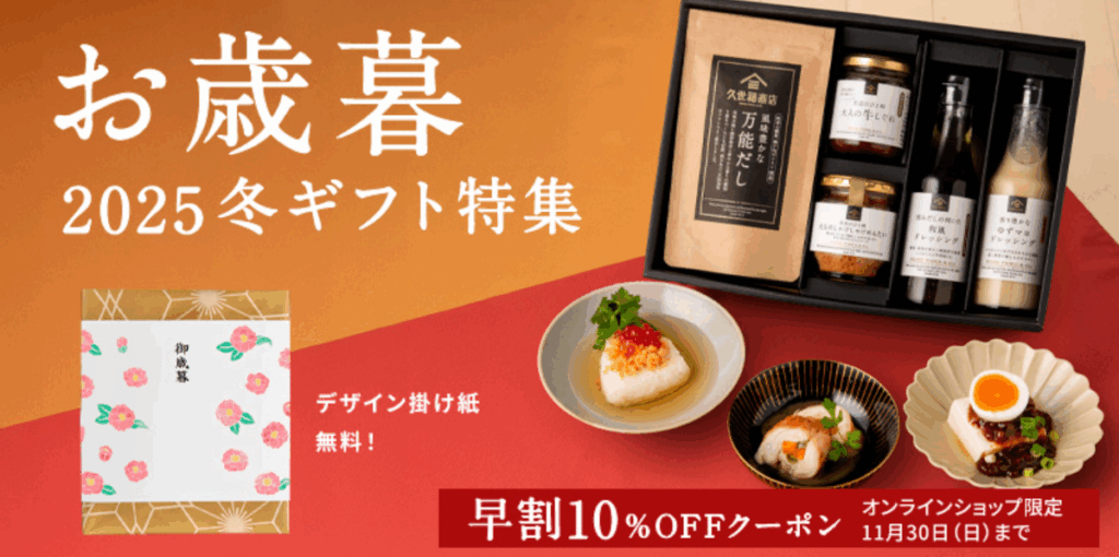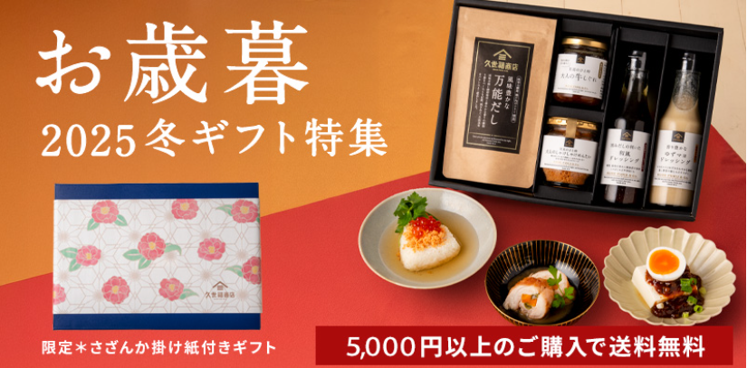 | 1位 | 久世福商店 | 万能だし・おかず味噌 | 3,000〜5,000円 | 贈り物に最適な和モダンデザイン。味も香りも上品。 | お歳暮・冬ギフト早割実施中 |